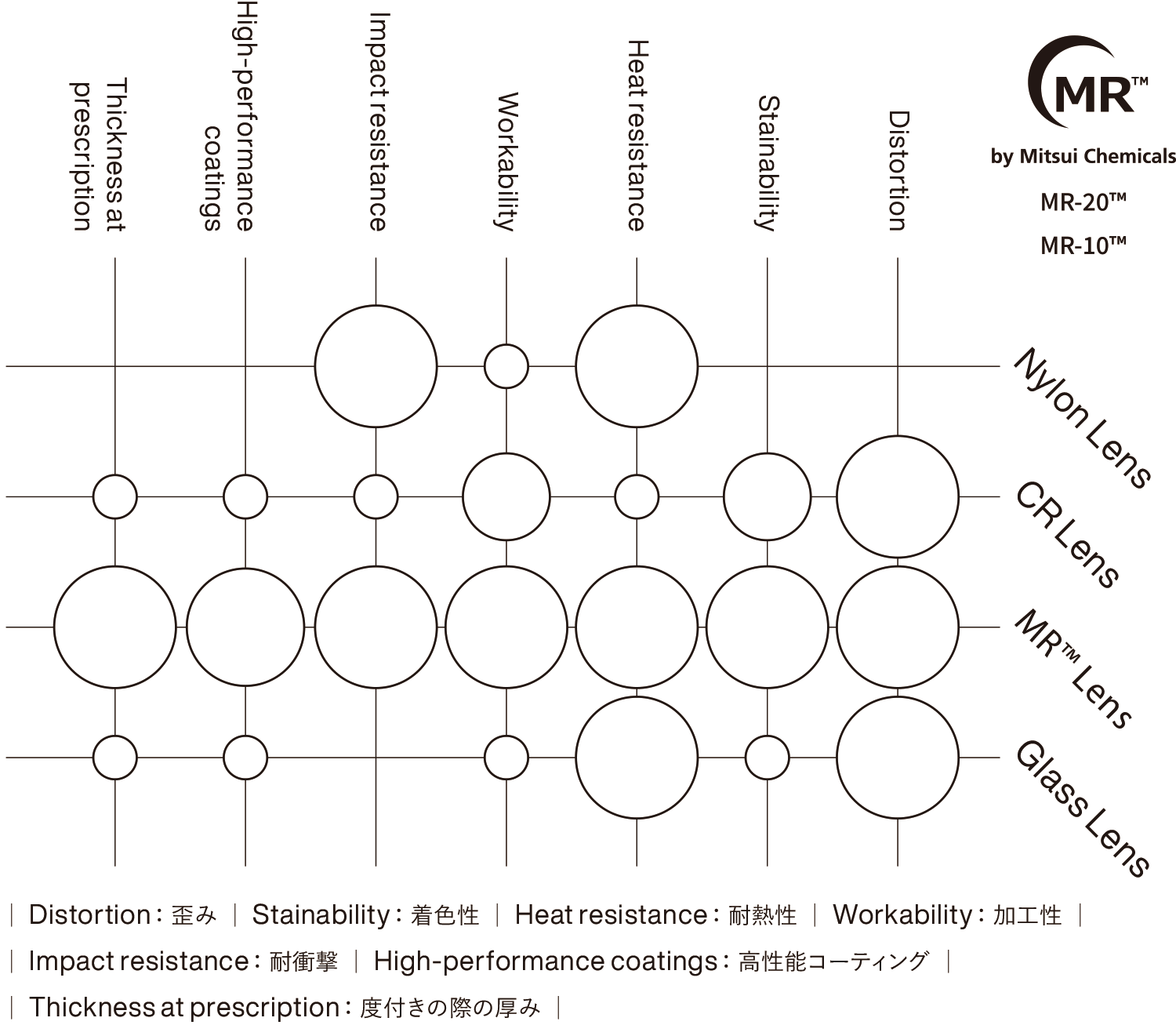 「MR™シリーズ」は、一般的に高屈折レンズに用いられる高級素材で、耐熱性・染色性・加工性・偏光フィルムとの密着性に優れています。