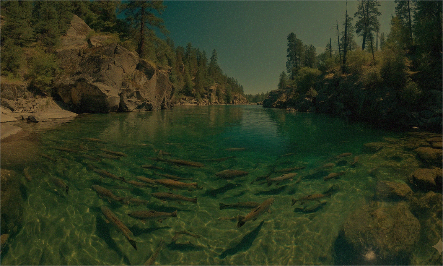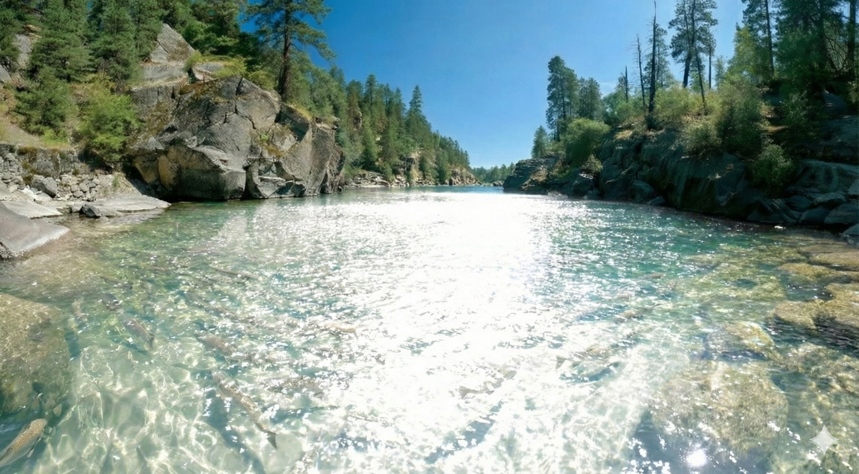 見え方イメージ偏光レンズは、水面のギラつきを強力にカットするため、渓流釣りなどのウォータースポーツで絶大な効果を発揮します。