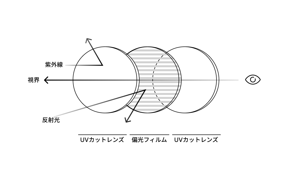 偏光レンズ内部にある偏光シートは、ブラインド(目隠し)のような役割を果たします。このシートが、水平方向から侵入してくる不快な反射光をシャットアウトし、目にとって必要な垂直方向の光だけを透過させます。
