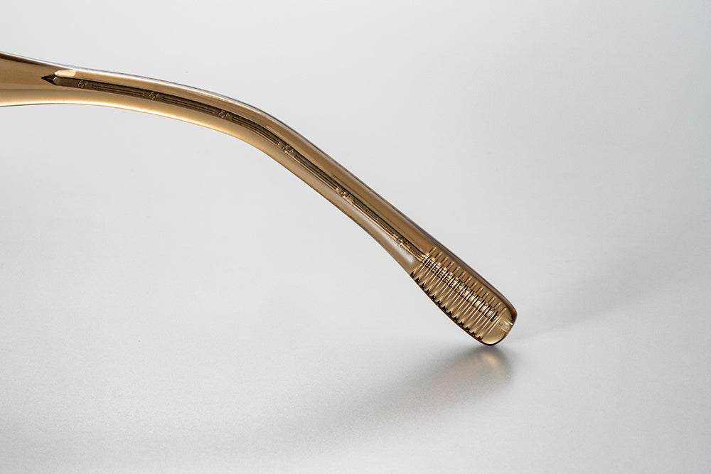 通常調整が難しいTR90素材のテンプル内部にオリジナル柄入り芯を組み込んだアジャスタブルテンプル仕様。またテンプル先端部分のみに芯を組み込むことで最適な比重バランスでの装用が可能。